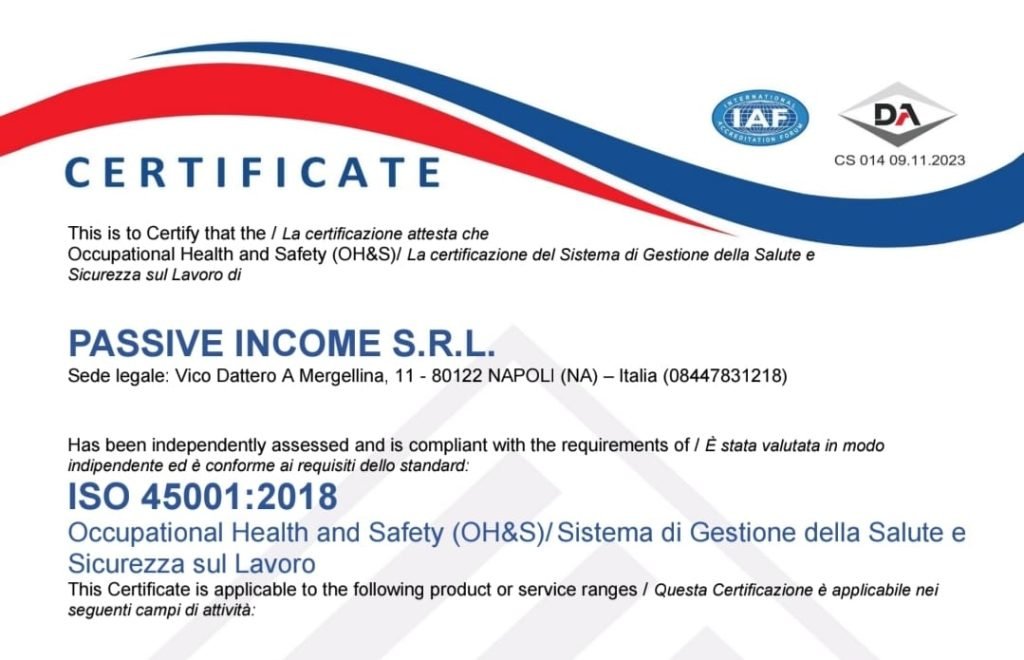 La ISO 45001:2018 rappresenta oggi il modello globale più avanzato per garantire luoghi di lavoro sicuri e responsabili. Il suo ottenimento certifica l’impegno costante di Hub Affiliations nel prevenire rischi, ridurre situazioni potenzialmente dannose e promuovere una cultura organizzativa attenta al benessere psicofisico di tutti i collaboratori.