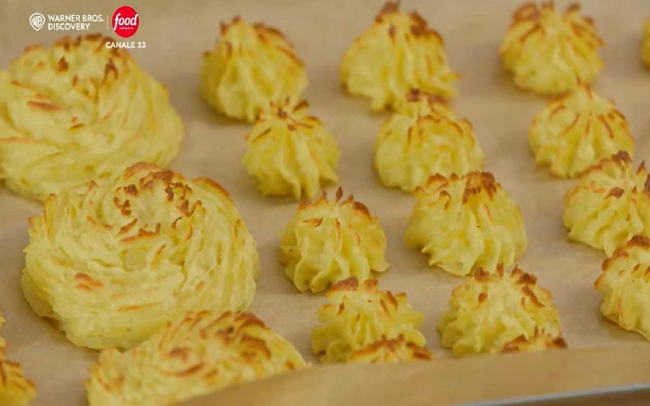 Su una teglia foderata con carta forno, si disegnano le patate duchessa utilizzando la sacca da pasticcere, creando delle piccole roselline ben distanziate tra loro. Infine, le patate vanno infornate a 200° per circa 20 minuti, finché non risulteranno dorate e croccanti.