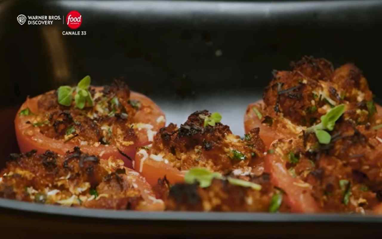 Infine, si unisce della ricotta salata grattugiata al composto preparato e si utilizza per farcire i pomodori scavati. I pomodori ripieni vengono poi disposti su una pirofila, spolverati con altra ricotta e olio, e infornati a 180°C in modalità statica per circa 20 minuti.