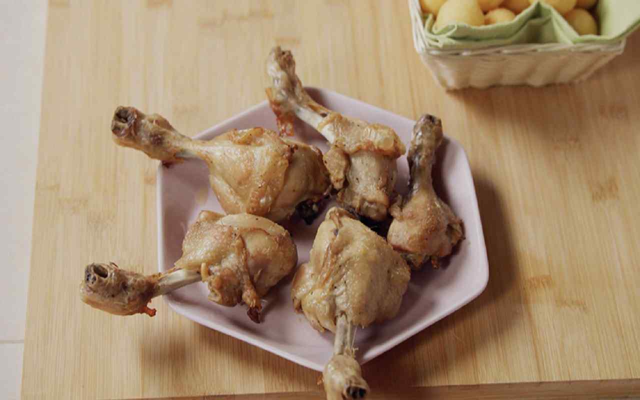 Una volta pronte le palline di patate, si riprendono i fusi di pollo e si dispongono in una teglia rivestita di carta forno. Si condiscono con un filo d’olio d’oliva e si cuociono in forno statico a 180-190°C per un’ora, oppure in forno ventilato a 170°C. Nel frattempo, si procede con la frittura delle palline di patate, immergendole in olio caldo e girandole di tanto in tanto fino a doratura. Una volta pronte, vengono scolate su carta paglia per eliminare l’olio in eccesso.