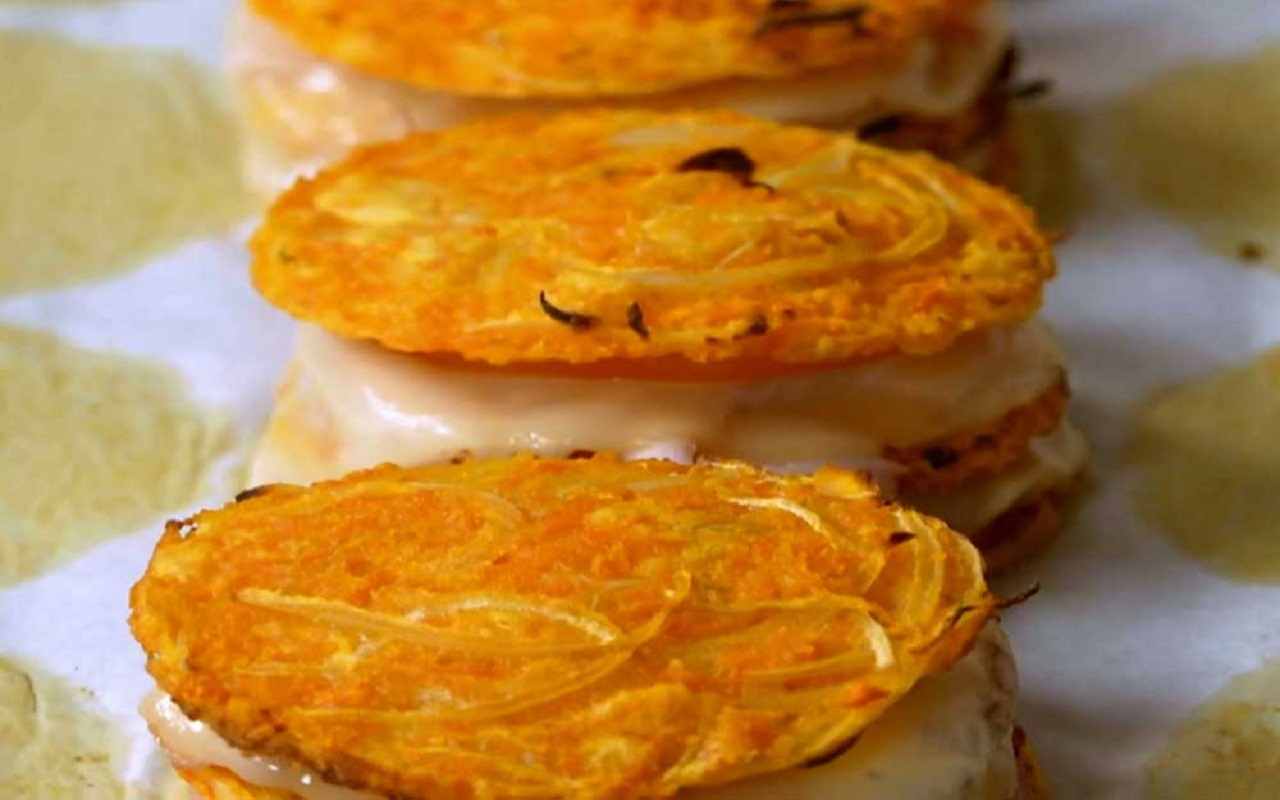 Una volta pronti i rosti, si passa alla composizione della millefoglie. Si farciscono quattro rosti con una fetta di prosciutto cotto, una fetta di scamorza e una fetta di pomodoro. Si sovrappone un altro disco di rosti e si ripete lo stesso strato di prosciutto cotto, scamorza e pomodoro. Si chiude infine con gli ultimi quattro rosti di carote.