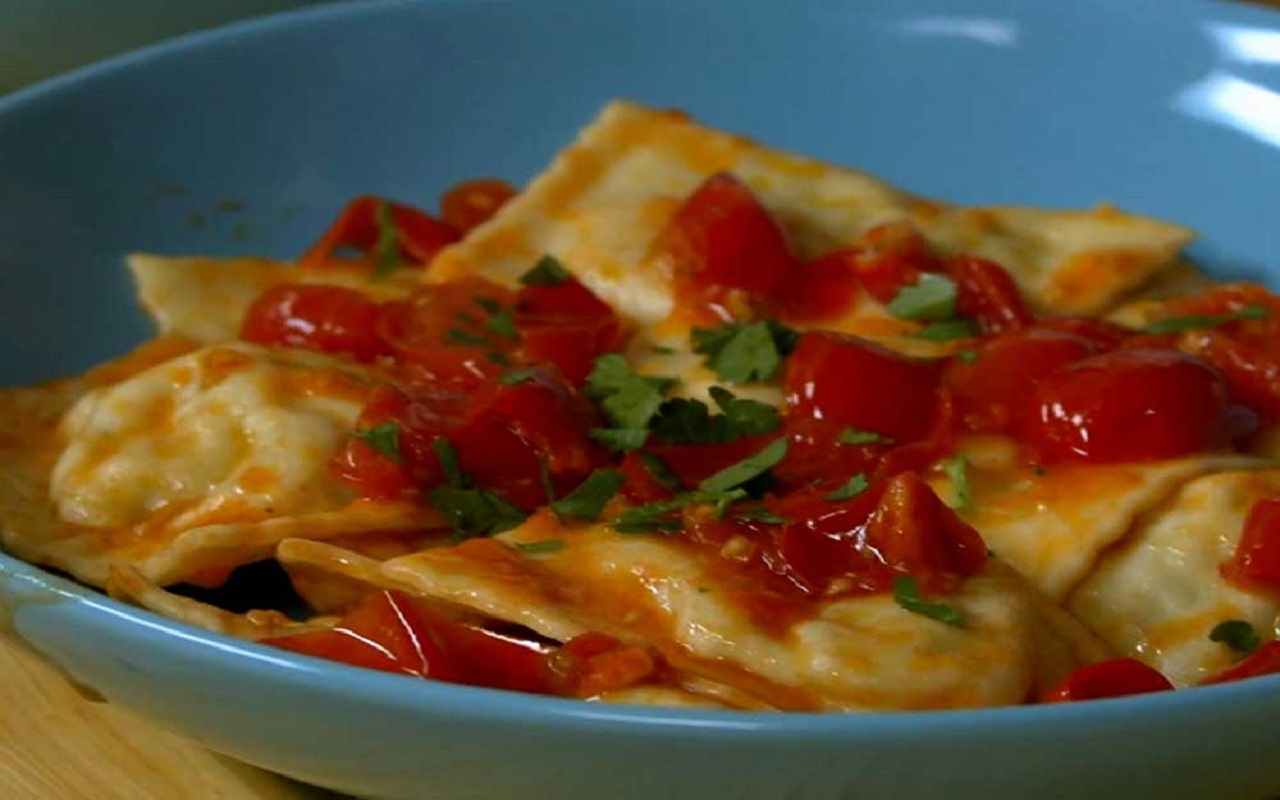 Nel frattempo, si prepara il sugo per condire i ravioli. In una pentola si mette un po’ d’olio e si fanno appassire i pomodorini tagliati. Si regola di sale e si lascia cuocere per alcuni minuti. Una volta che i ravioli sono cotti, vengono scolati e ripassati in padella con il sugo preparato.
