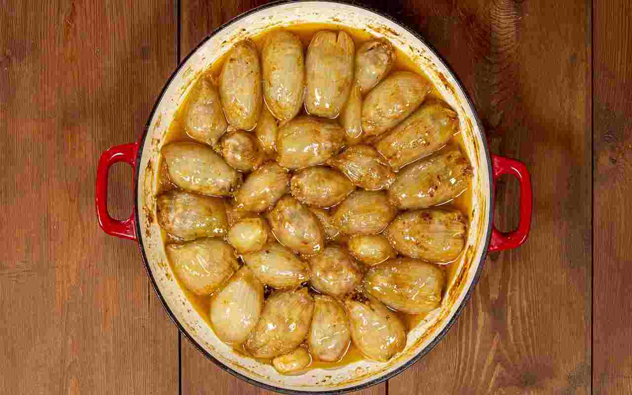 Una volta che le cipolle sono fredde, vengono delicatamente sfogliate e con i veli ottenuti si formano degli involtini, riempiti con il composto preparato in precedenza. Le cipolle ripiene vengono quindi posizionate in una casseruola con un filo d’olio e i cuori di cipolla rimasti non riempiti. Si aggiunge la salsa di cottura in modo che il liquido sia all’altezza delle cipolle e si mette un piatto capovolto sopra di esse per tenerle ferme durante la cottura.