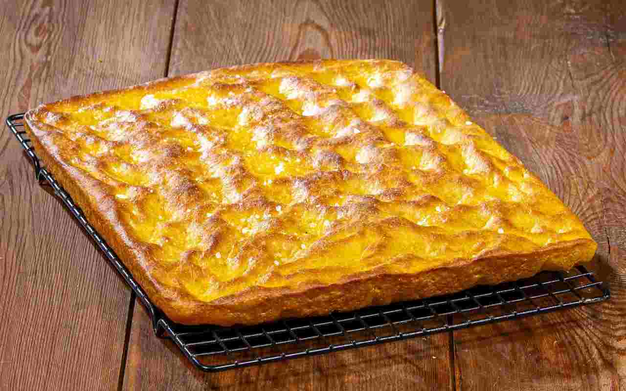 Una volta pronto, l’impasto va lavorato a mano per formare una palla e lasciato lievitare coperto da pellicola e un canovaccio per circa 1.30-2 ore, fino al raddoppio del volume. Trascorso questo tempo, l’impasto va steso uniformemente in una teglia unta d’olio e praticate delle fessure sulla superficie con i polpastrelli. Dopo aver cosperso la superficie con una miscela di acqua e olio, si lascia lievitare per altri 30-40 minuti, fino a quando l’impasto raggiunge quasi i bordi della teglia.
