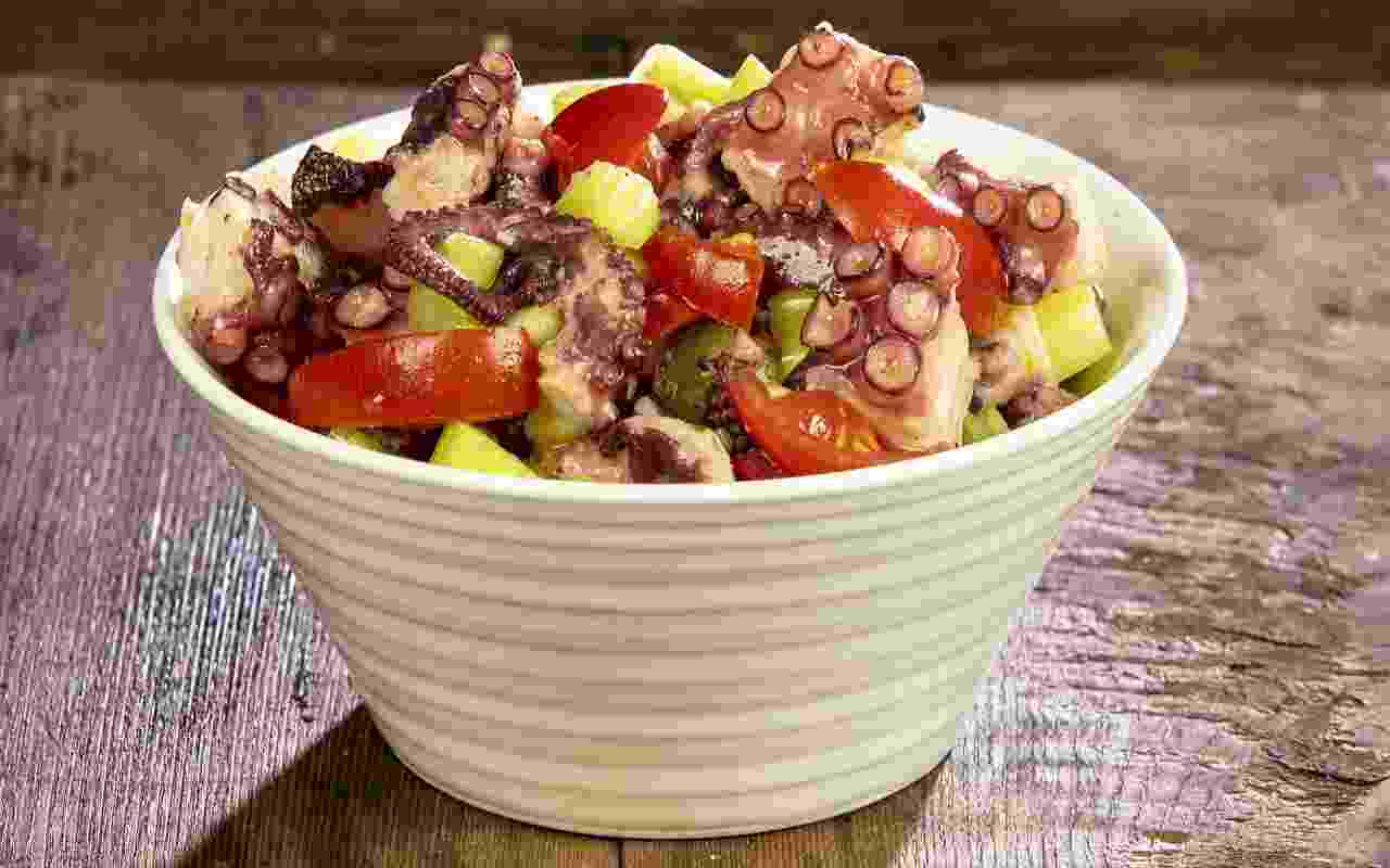 Tagliamo il polpo raffreddato a pezzi e lo uniamo al resto degli ingredienti nel contenitore. Mescoliamo bene il tutto e condiamo con l’emulsione preparata, assaggiando e regolando di sale se necessario. Continuiamo ad amalgamare gli ingredienti fino a ottenere una consistenza uniforme e gustosa.
