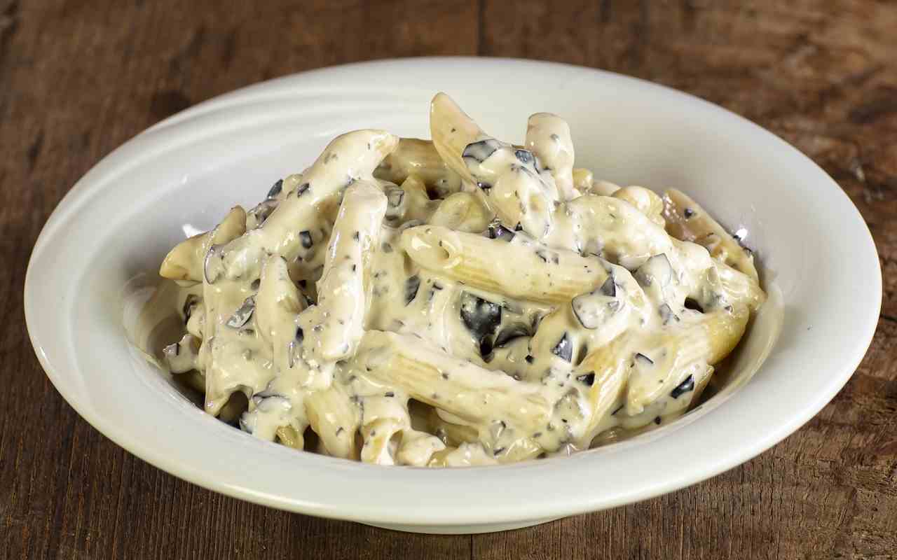 Una volta che il condimento è pronto, cuociamo la pasta in acqua bollente e salata e aggiungiamo le olive tritate alla padella con gli altri ingredienti, mantenendo il fuoco basso. Scoliamo la pasta qualche minuto prima del tempo indicato sulla confezione e terminiamo la cottura nella padella con il condimento, aggiungendo se necessario un po’ di acqua di cottura per rendere il sugo cremoso e regolando di sale.