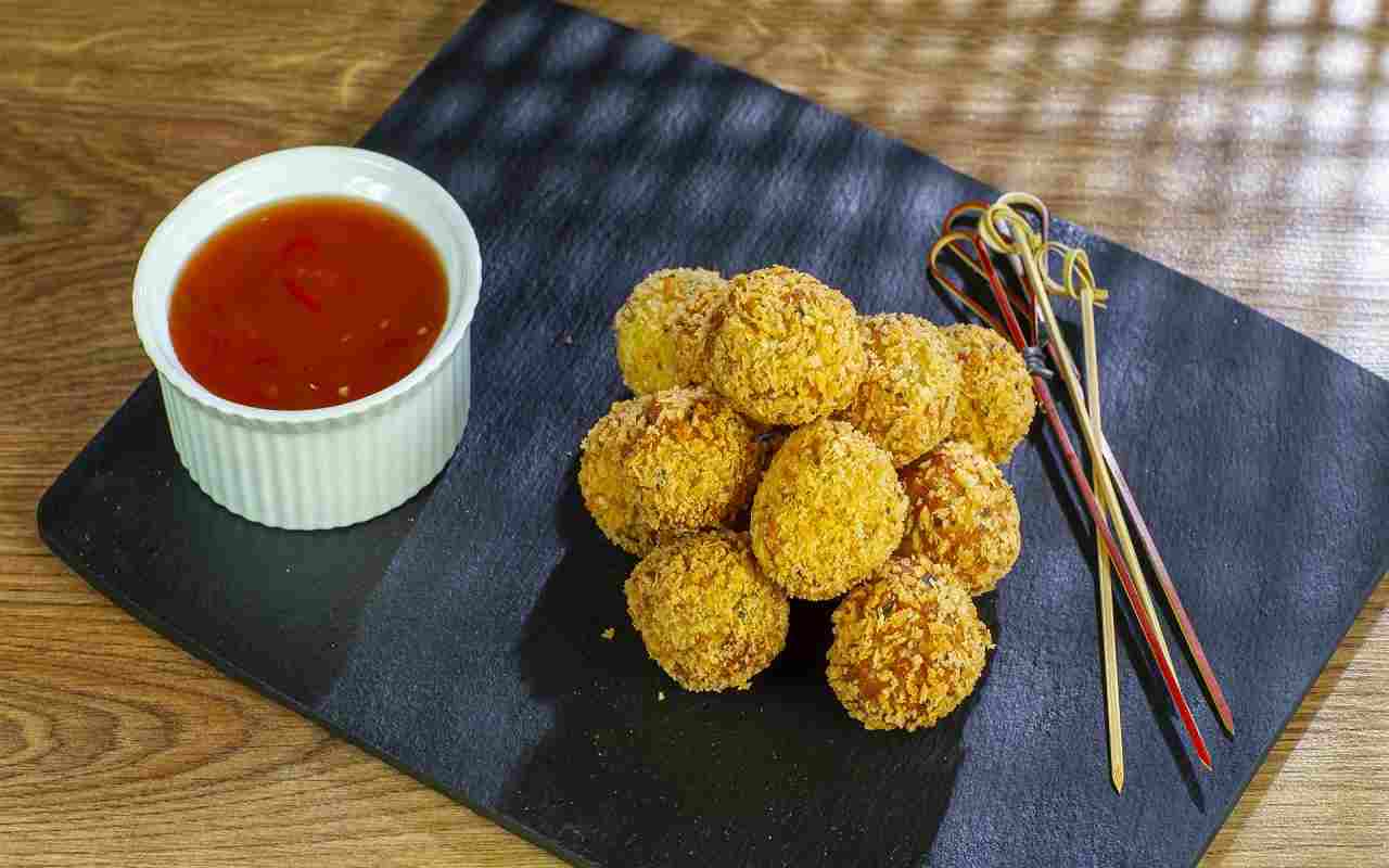 Mescoliamo bene il tutto e formiamo delle polpette delle dimensioni di una noce. Passiamo le polpette nel panko o nel pane grattugiato e friggiamole in olio caldo a 170°C fino a doratura. Una volta pronte, scoliamole su carta assorbente e serviamole con la salsa agrodolce preparata in precedenza.