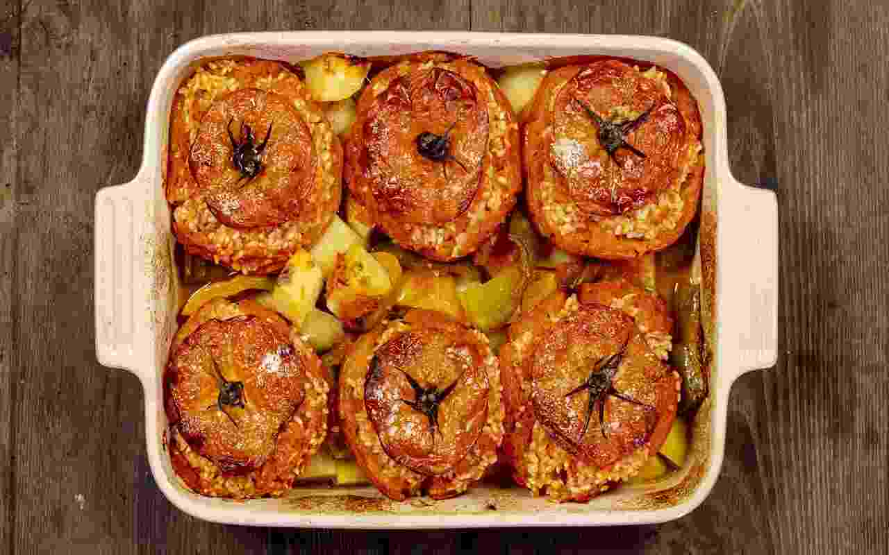 Procedere riempiendo i pomodori svuotati con il riso, stando attenti a non riempirli completamente in quanto il riso si gonfierà durante la cottura. Trasferire i pomodori ripieni nella teglia con le patate e i peperoni, distribuendo sopra di essi il composto di pomodoro frullato rimasto. Posizionare le calotte dei pomodori sulla loro parte superiore, salare tutti gli ingredienti e concludere con un giro d’olio.