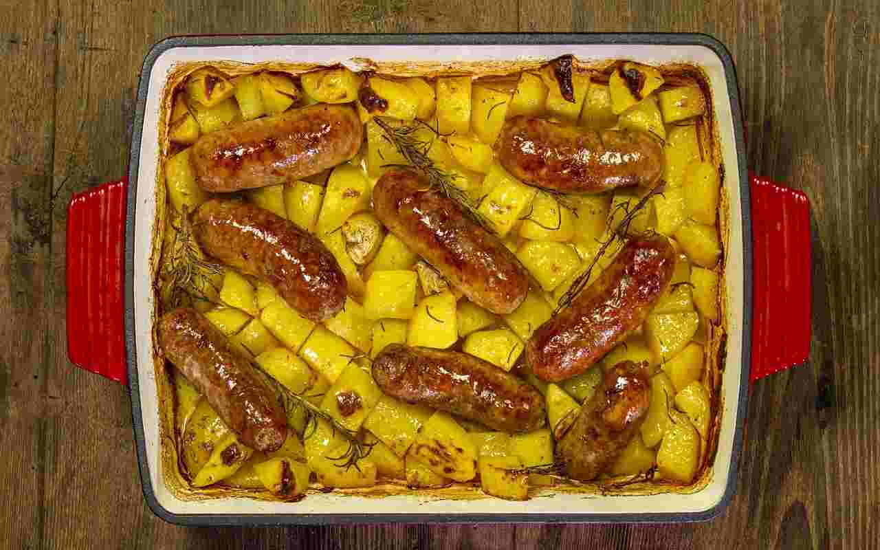 Versare nella teglia la marinata in modo che copra circa 1 cm di altezza e infornare il tutto a 230° per circa 45 minuti. Una volta che le salsicce e le patate sono cotte, sfornare e lasciare intiepidire leggermente prima di servire.