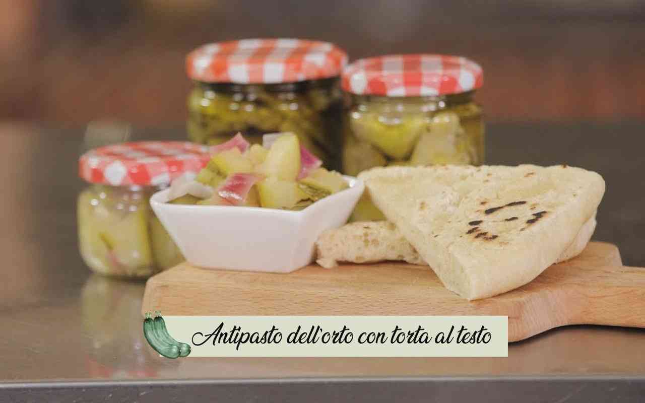La ricetta dell’antipasto dell’orto con torta al testo è un piatto che include verdure accompagnate da una torta salata umbra. Questo piatto è spesso servito nelle trattorie umbre insieme a salumi misti, salsicce alla brace, verdure fresche e cicoria ripassata in padella. La preparazione inizia con la pulizia e il taglio delle zucchine e della cipolla, che vengono successivamente bollite in una soluzione di aceto, zucchero e sale. Una volta cotte, le verdure vengono messe nei vasetti sterilizzati e aggiunte con un mix di aromi, aglio, sale e olio. I vasetti vengono chiusi e capovolti fino al completo raffreddamento. Per quanto riguarda la torta al testo, si inizia mischiando la farina con il lievito, aggiungendo acqua e sale. L’impasto ottenuto viene lavorato fino ad ottenere una consistenza liscia e omogenea, per poi farlo riposare per un’ora. Dopo il riposo, si formano tre palline di impasto che vengono stese con le mani e cotte su un testo caldo per circa 5 minuti per lato. La torta al testo viene poi servita con le verdure in agrodolce.