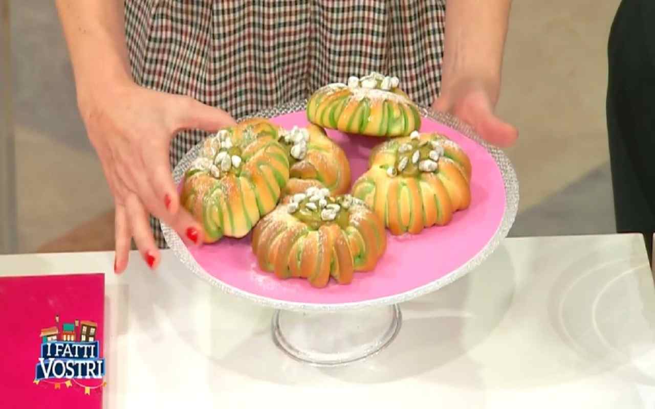 Successivamente si prende la seconda metà dell’impasto e si aggiunge della pasta di pistacchio, lavorando l’impasto per altri 10 minuti e lasciandolo lievitare nuovamente fino al raddoppio del volume. Si procede quindi ricavando delle palline di impasto di 50g e stendendole ad uno spessore di 2 mm per ottenere una forma ovale.