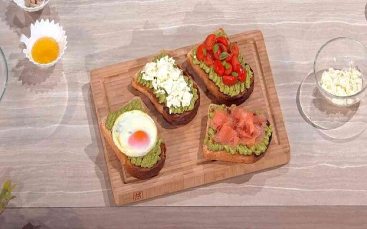 Per preparare la crema di avocado, schiacciare la polpa dell’avocado con una forchetta e condirla con succo di lime, cipolla cruda tritata, menta tritata, olio, sale e pepe. Spalmare la crema di avocado su ogni fetta di pane e aggiungere sopra un uovo al tegamino, delle fette di salmone affumicato, pepe rosa e semi. È possibile anche optare per altre varianti: crema di avocado e pomodorini conditi con olio e basilico, oppure crema di avocado e feta.