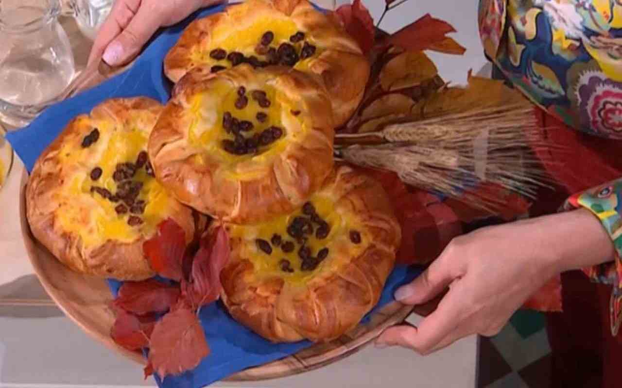 Il giorno successivo, stendiamo l’impasto freddo su un piano, creando un rettangolo spesso circa 1 cm e dividiamolo in 6-8 quadrati uguali. Su metà dei quadrati, spalmiamo il burro a pomata con le mani. Sovrapponiamo i quadrati non imburrati in modo sfalsato e ripieghiamo le punte dei due quadrati verso il centro della brioche, premendo bene. Al centro della brioche, creiamo una spirale di crema pasticcera e aggiungiamo dell’uvetta. Copriamo e lasciamo lievitare per un’ora in un luogo caldo.