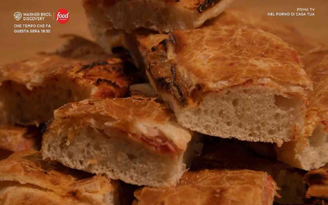 Dopo la lievitazione, prendiamo l’impasto e lo allarghiamo sul piano di lavoro, arrotolandolo su se stesso per formare un filone. Mettiamo il filone su una teglia precedentemente unta d’olio e copriamo nuovamente, lasciando lievitare per altre 2 ore a temperatura ambiente. Una volta pronto, allarghiamo l’impasto direttamente nella teglia con le mani.