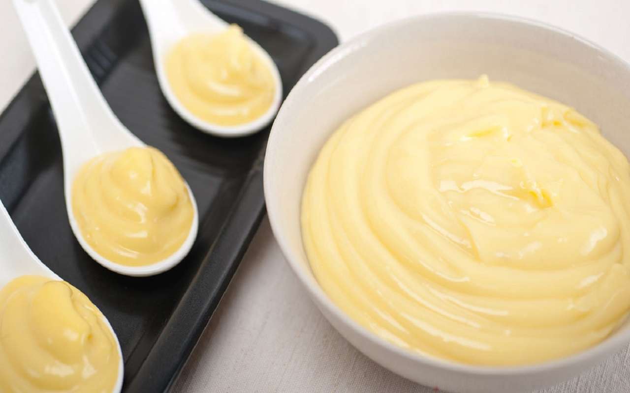 Per raffreddare rapidamente la crema, si prende la ciotola dal freezer e si versa la crema al suo interno. Si mescola velocemente con la frusta fino a portare la crema a una temperatura di 50°, al di sotto del punto di cottura. L’obiettivo è ottenere una crema liscia e lucida. A questo punto, la crema pasticcera è pronta per essere utilizzata o conservata in frigorifero coprendola con della pellicola.