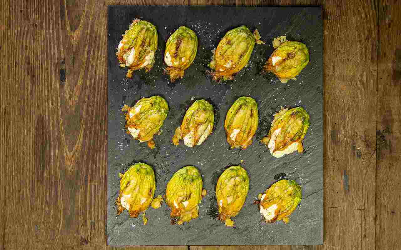 I fiori di zucca vengono quindi farciti con la sac-à-poche riempiendoli quasi completamente e sigillandoli chiudendo le punte. Successivamente, vengono adagiati su una leccarda rivestita con carta da forno in vista della cottura.