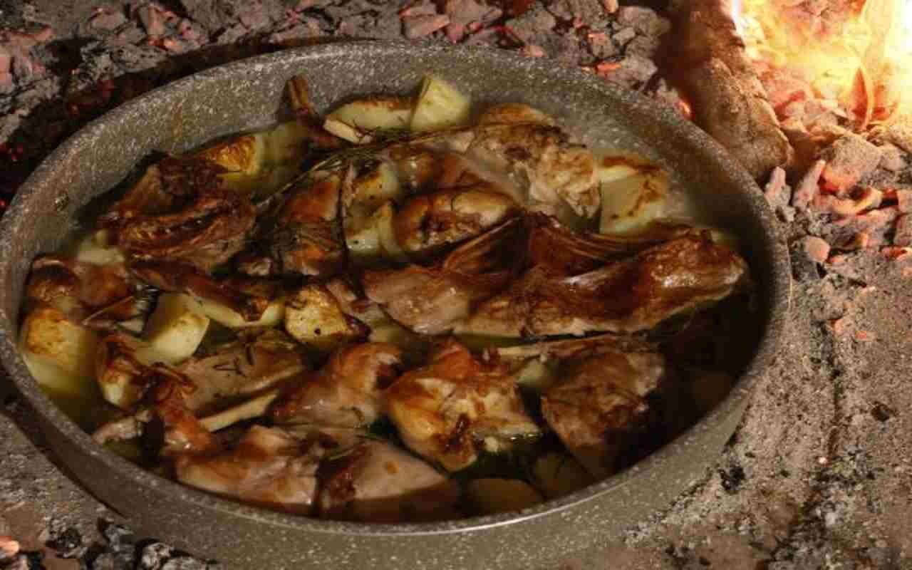 La preparazione di questo piatto inizia con il taglio dell’agnello in pezzi di circa 25 grammi ciascuno che vengono fatti dorare in un tegame di terracotta precedentemente riscaldato con dell’olio extravergine d’oliva. Una volta che l’agnello risulta ben dorato, viene ritirato e tenuto da parte in attesa di essere aggiunto nuovamente al piatto più avanti.