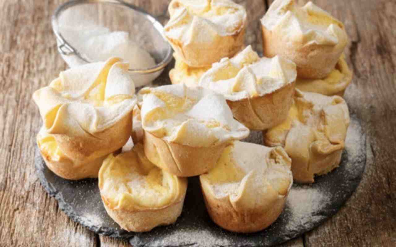 Dopo il riposo dell’impasto, si stende la pasta fino ad ottenere uno spessore di circa 3 mm e si taglia in 12 quadrati da 10×10 cm. Si unta uno stampo da muffin con del burro e si spolvera con della farina, quindi si dispongono i quadrati di sfoglia all’interno degli spazi, lasciando fuori i lembi. Ogni quadrato viene riempito con circa 60 g di crema e i lembi vengono ripiegati verso l’interno senza sigillarli. Gli stampi vanno infornati a 180° per 30 minuti, poi la temperatura va abbassata a 160° e cuocere per altri 35 minuti fino a quando i soffioni saranno ben dorati.
