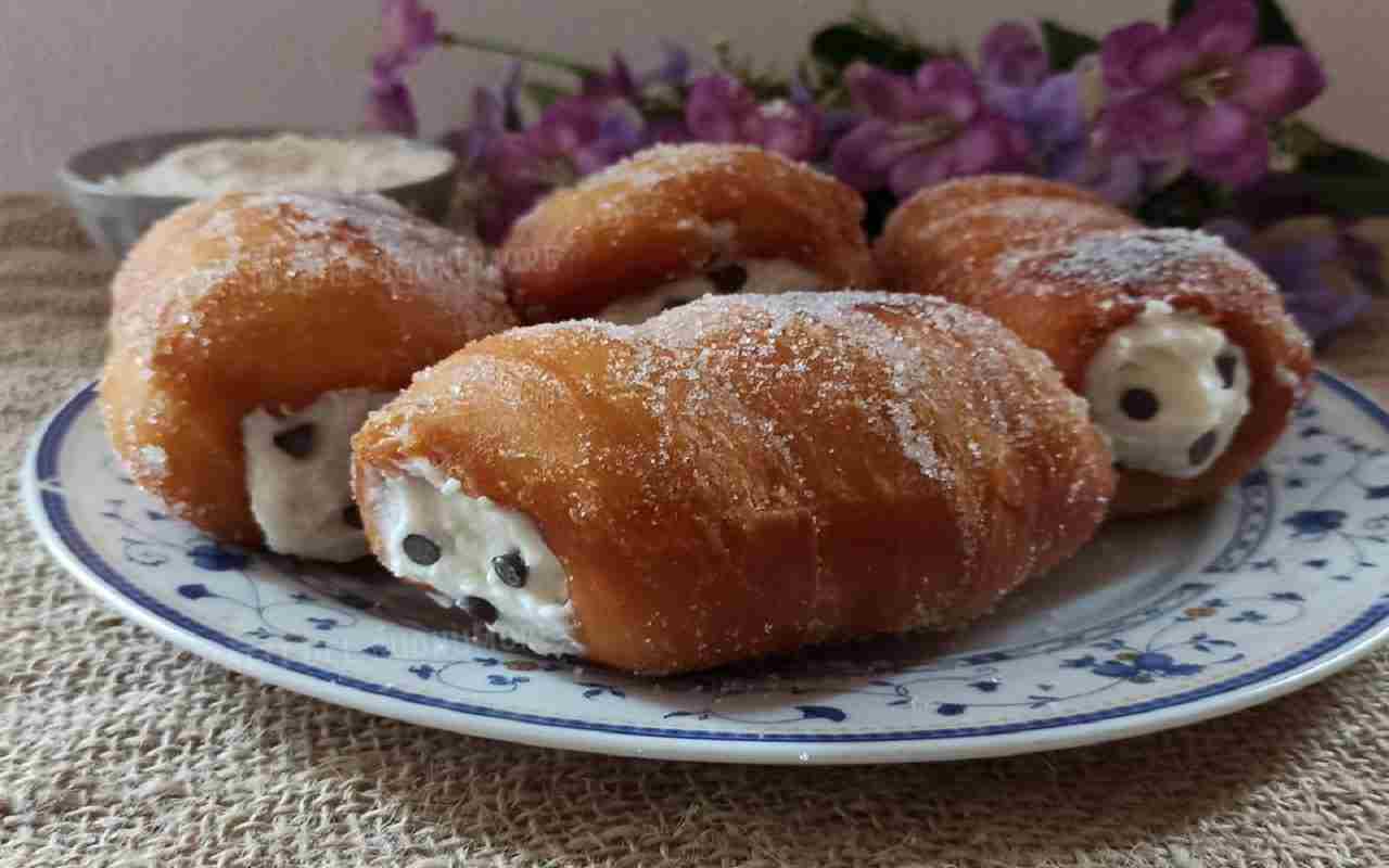 Nel frattempo, si prepara la farcitura mescolando la ricotta con lo zucchero e lasciandola riposare in frigorifero per 4 ore. Si aggiungono poi le gocce di cioccolato e si ripone nuovamente in frigorifero. Una volta che l’impasto è lievitato, si prelevano dei pezzetti di circa 75 g ciascuno e si formano dei cilindretti che vengono arrotolati intorno a dei cilindri per cannoli. Dopo un’ora di lievitazione, i cartocci vengono fritti in olio di semi a 165°, dorandoli uniformemente e scolandoli su carta da cucina.
