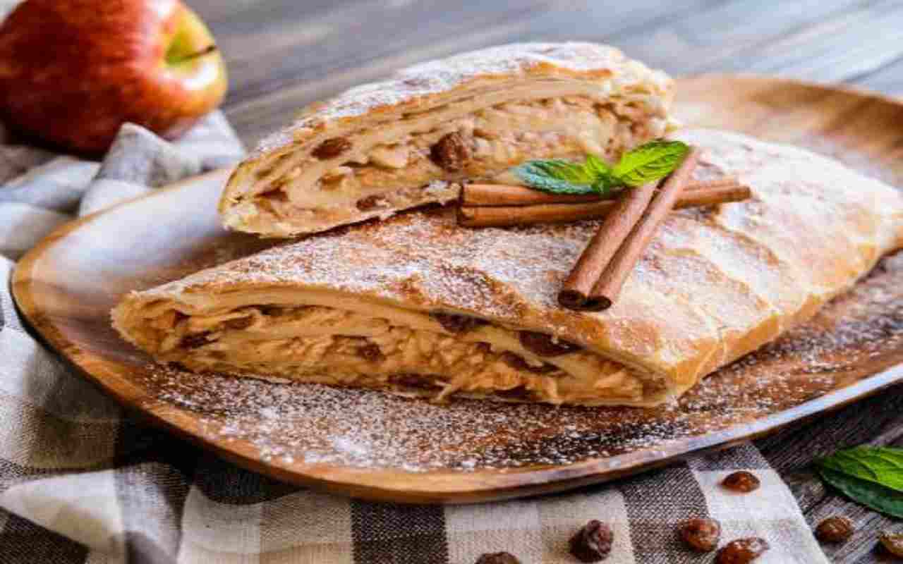 Successivamente, si fa fondere il burro rimasto in un pentolino a fuoco dolce. Si stende il panetto di pasta su un canovaccio infarinato formando un rettangolo e si spennella la superficie con burro fuso, cospargendola con il pangrattato tostato. Si adagia il composto con le mele sulla pasta e si arrotola lo strudel dalla parte più lunga, sigillandolo bene sui lati. Si mette lo strudel su una teglia rivestita con carta da forno, con la chiusura verso il basso, e si spennella con il burro fuso prima di infornarlo.