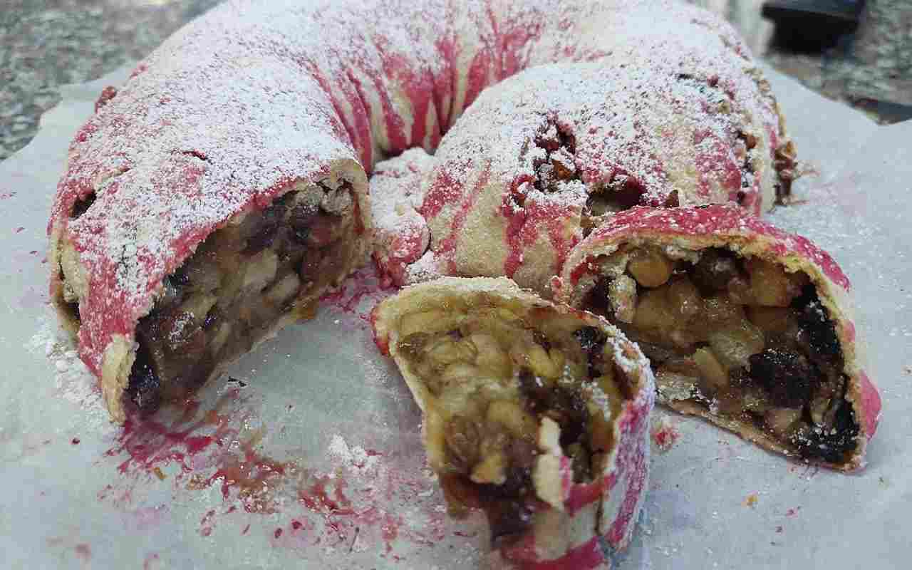 Nel frattempo, si prepara il ripieno della rocciata umbra. Si lascia l’uvetta in ammollo con del rum e si pelano le mele, tagliandole a cubetti. Si grattugia la scorza di limone e si mescolano tutti gli ingredienti del ripieno insieme alla frutta secca. Una volta che il ripieno è pronto, si recupera l’impasto e si stende con il matterello fino ad ottenere una sfoglia sottile. Si distribuisce il ripieno sulla superficie della sfoglia, lasciando un margine dai bordi, e si arrotola la sfoglia per formare un cilindro, che viene poi arrotolato di nuovo per ottenere una spirale.