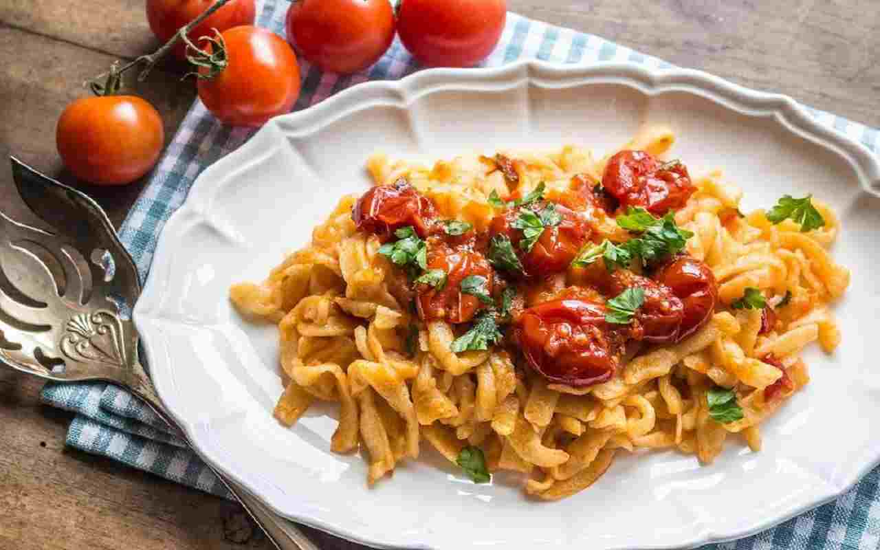 Nel frattempo, si può preparare il sugo per gli strangozzi alla spoletina. Si inizia prendendo dei pomodori, mondandoli, lavandoli e tagliandoli in quarti. In una padella antiaderente si fa rosolare dell’aglio con dell’olio extravergine di oliva e, una volta che l’aglio sarà imbiondito, si toglie e si aggiungono i pomodori. Si insaporisce il tutto con sale e pepe (o peperoncino, a seconda dei gusti) e si lascia cuocere per circa 30 minuti a fuoco dolce, fino a che il sugo non sarà diventato piuttosto denso.