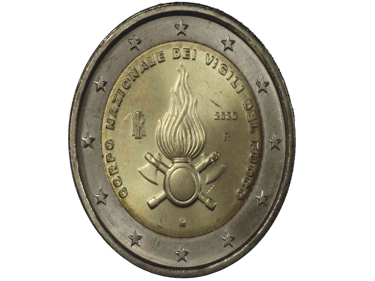 Al centro della moneta è posto il logo del Corpo Nazionale dei Vigili del Fuoco. Nel campo di sinistra troviamo le lettere “RI” che sono l’acronimo della Repubblica Italiana mentre nel campo di destra è presente l’anno di emissione “2020”. A seguire abbiamo anche la lettera “R”, che rappresenta l’identificativo della Zecca di Roma e in basso, “LDS”, ovvero la sigla dell’autrice Luciana De Simoni,